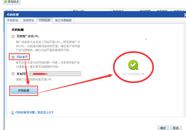 6、返回百度商桥客户端—代码管理—点击 “代码检测”(右下角)--选择“网站首页”---点击“开始检测”