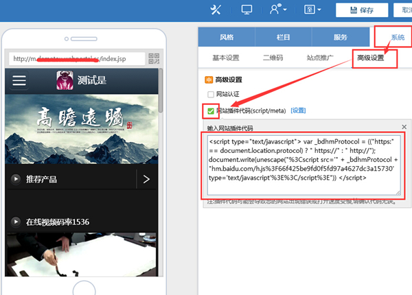 5、进入手机版网站后台—系统---高级设置---添加“移动商桥代码”-—保存
