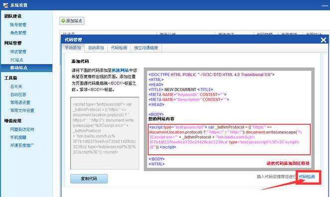 3、添加站点后,点击“已启用”前面的那个灰色按钮“代码管理”--手动添加--复制代码